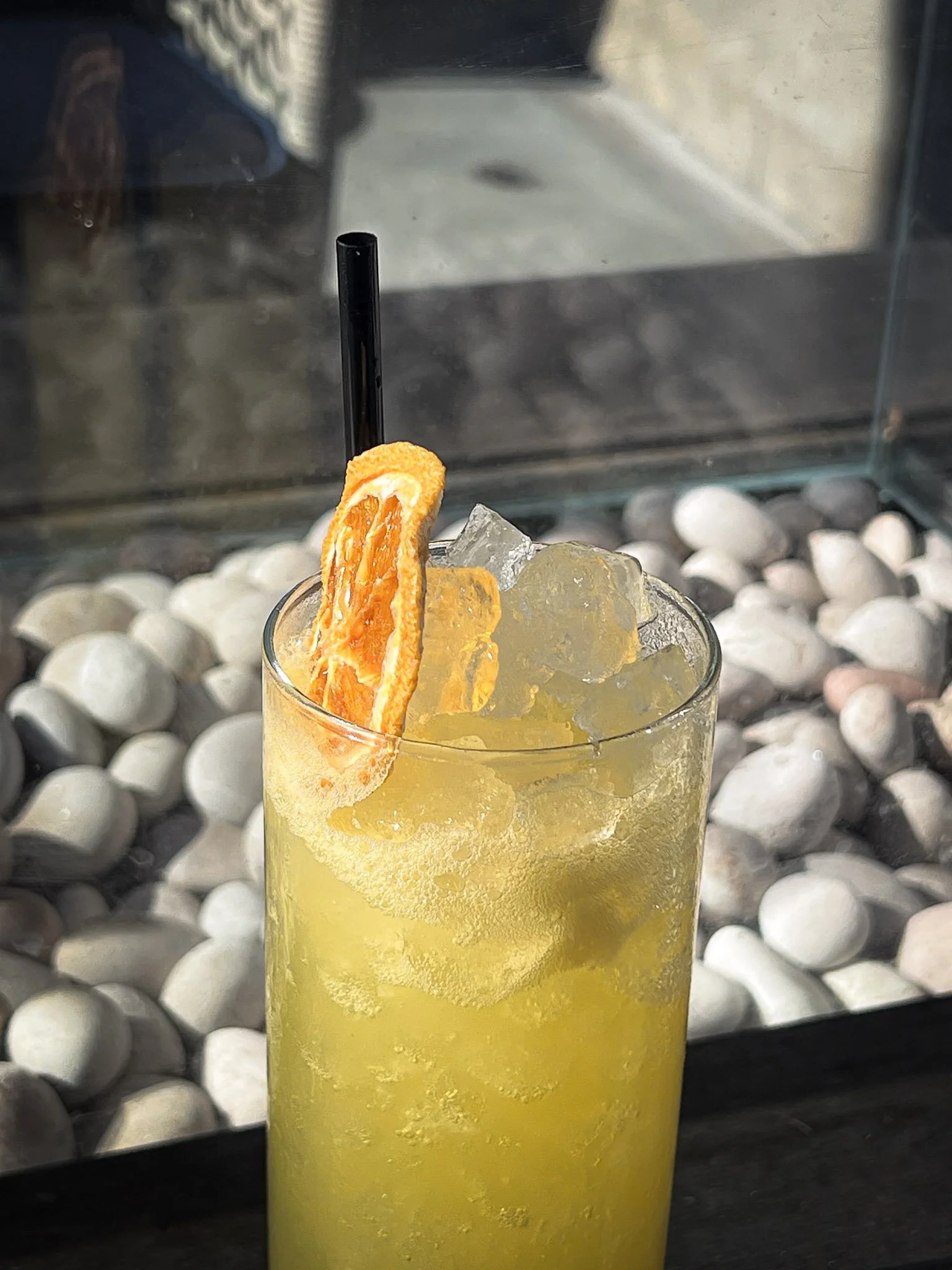 A tall glass of yellow citrus beverage garnished with an orange slice and a black straw, with ice cubes inside.